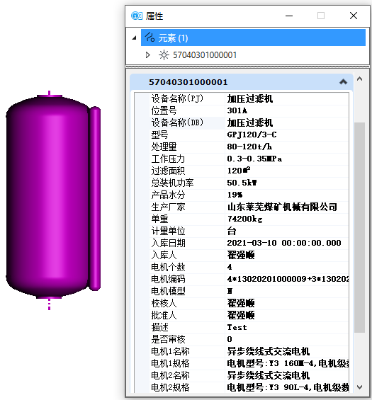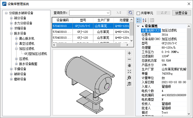上图中,图5为利用“设备库”组件放置分级脱水破碎设备的操作界面,界面左侧为层级展示区,中部为模型检索及预览区,右侧为属性区,放置设备前可对附加属性进行修改,GPJ120/3-C型加压过滤机的信息模型放置后的属性框如图6所示。