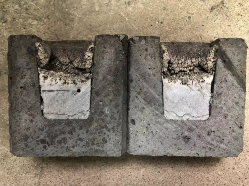 一是材料抗渣侵蚀性能。图2为浇注料抗渣铁侵蚀试验结果,渣铁混合物于1500℃条件下在浇注料所制成的坩埚里面浸泡7天后,分析横纵剖面,观察试块被浸润情况。可以很清楚看到,浇注料与渣铁界面清晰分离,且无任何物理和化学反应情况。该材料用于风口带整体浇注,高炉运行过程,能在浇注体表面形成稳定的渣铁粘滞层作为保护,因此材料具备既能抗渣铁侵蚀又能利用渣铁形成保护的特点。