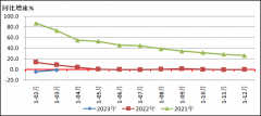 图1是2023年1-3月和2022年、2021年重点联系企业营业收入同比增速情况的对比。