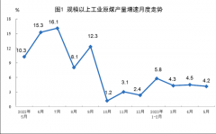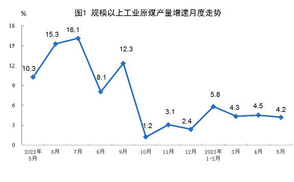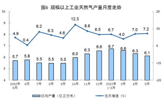 5月份,规模以上工业主要能源产品生产均保持同比增长。与4月份比,原煤、电力生产略有放缓,原油、天然气生产有所加快。