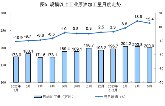 原油加工保持较快增长,增速有所回落。5月份,加工原油6200万吨,同比增长15.4%,增速比4月份回落3.5个百分点,日均加工原油200.0万吨。1—5月份,加工原油30263万吨,同比增长9.8%。