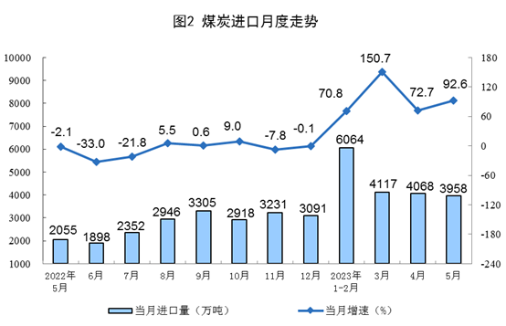 原煤生产保持稳定,进口持续高位增长。5月份,生产原煤3.9亿吨,同比增长4.2%,增速比4月份放缓0.3个百分点,日均产量1243万吨。进口煤炭3958万吨,同比增长92.6%,增速比4月份加快19.9个百分点。