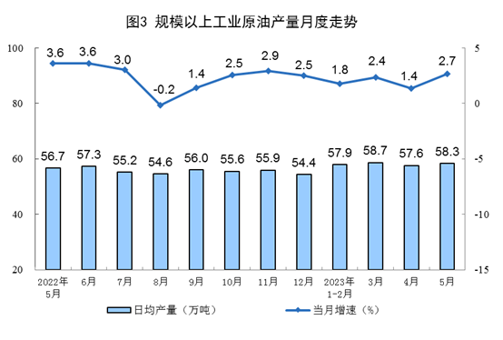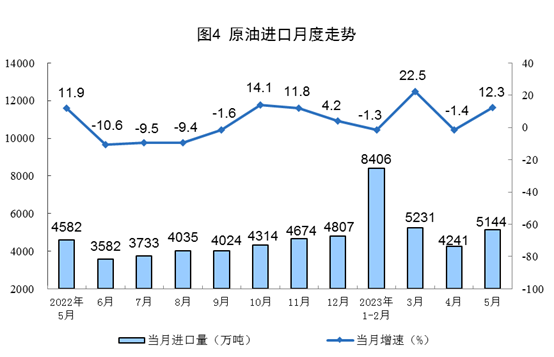 原油生产有所加快,进口由降转增。5月份,生产原油1807万吨,同比增长2.7%,增速比4月份加快1.3个百分点,日均产量58.3万吨。进口原油5144万吨,同比增长12.3%,4月份为下降1.4%。