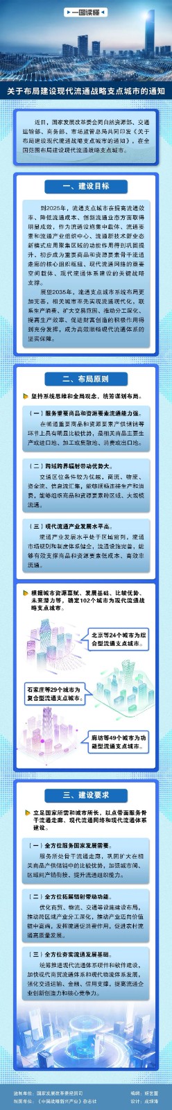 为贯彻党的二十大报告有关部署、落实《“十四五”现代流通体系建设规划》相关要求,推动构建高效顺畅的现代流通体系,近日,国家发展改革委会同自然资源部、交通运输部、商务部、市场监管总局印发《关于布局建设现代流通战略支点城市的通知》,部署现代流通战略支点城市布局建设工作。