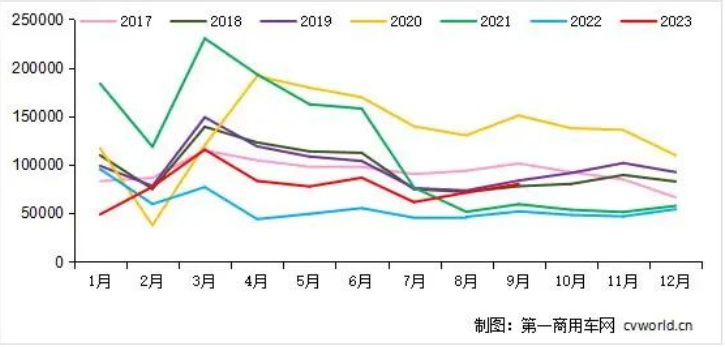2017-2023年我国重卡市场销量月度走势图(单位:辆)