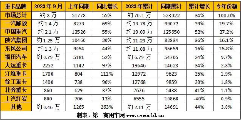 具体来看,一汽解放今年9月份销售重卡约1.4万辆,同比上涨近7成;1-9月,解放重卡累计销量约为13.78万辆,同比增长39%,市场占有率约19.7%,同比增加了0.7个百分点。