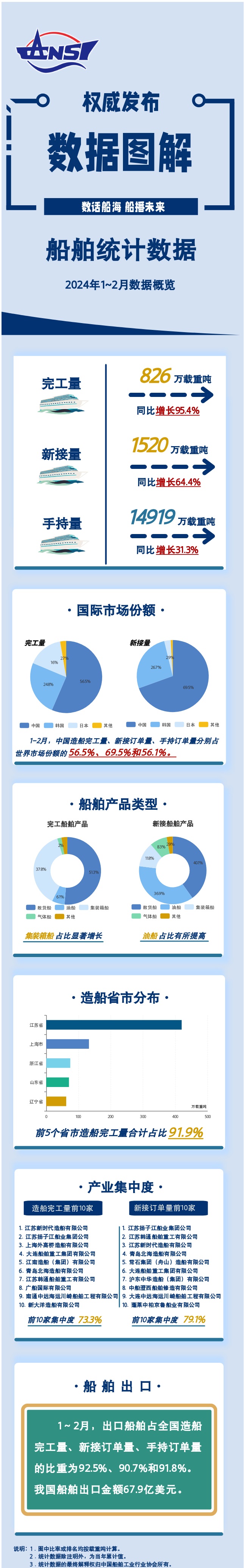 2024年1-2月,全国造船完工量826万载重吨,同比增长95.4%;新接订单量1520万载重吨,同比增长64.4%。截至2月底,手持订单量14919万载重吨,同比增长31.3%。