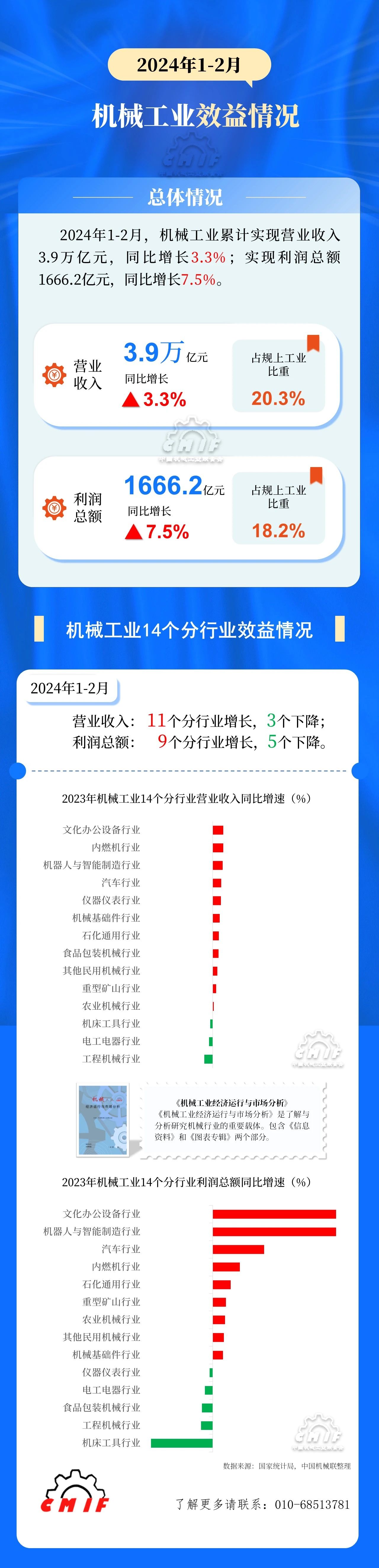 中国机械工业联合会最新数据显示,2024年1-2月,机械工业累计实现营业收入3.9万亿元,同比增长3.3%;实现利润总额1666.2亿元,同比增长7.5%。
