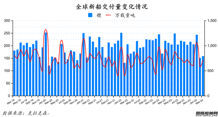 2024年3月份全球船厂共交付新船158艘,共计7,127,045载重吨。与2024年2月份全球新船交付订单151艘,共计5,767,949载重吨相比较,数量环比上升4.64%,载重吨环比上升23.56%。与2023年3月份全球船厂共交付新船219艘,共计9,274,998载重吨相比较,数量同比下跌27.85%,载重吨同比下降23.16%。