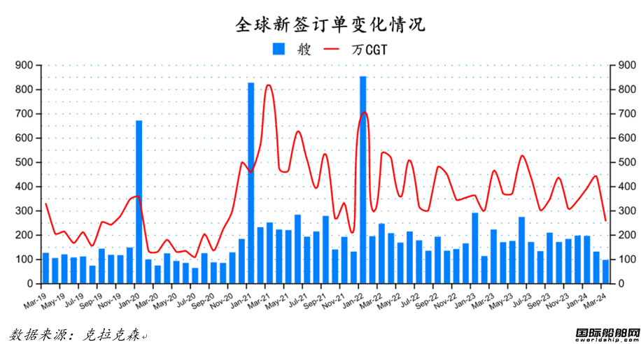 根据克拉克森最新数据统计(截至2024年4月9日),2024年3月份全球新签订单96艘,共计2,597,141CGT。与2024年2月份全球新签订单130艘,共计4,432,942CGT相比较,数量环比减少34艘,修正总吨环比下降41.41