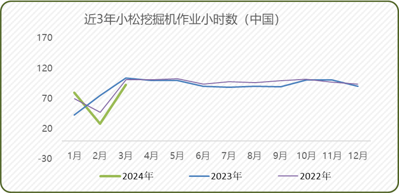 2024年3月,中国地区小松挖掘机开工小时数为93.0小时,同比下降10.8%,降幅环比2月大幅度改善原因主要系2024年2月为春节因素影响,开工率较低。