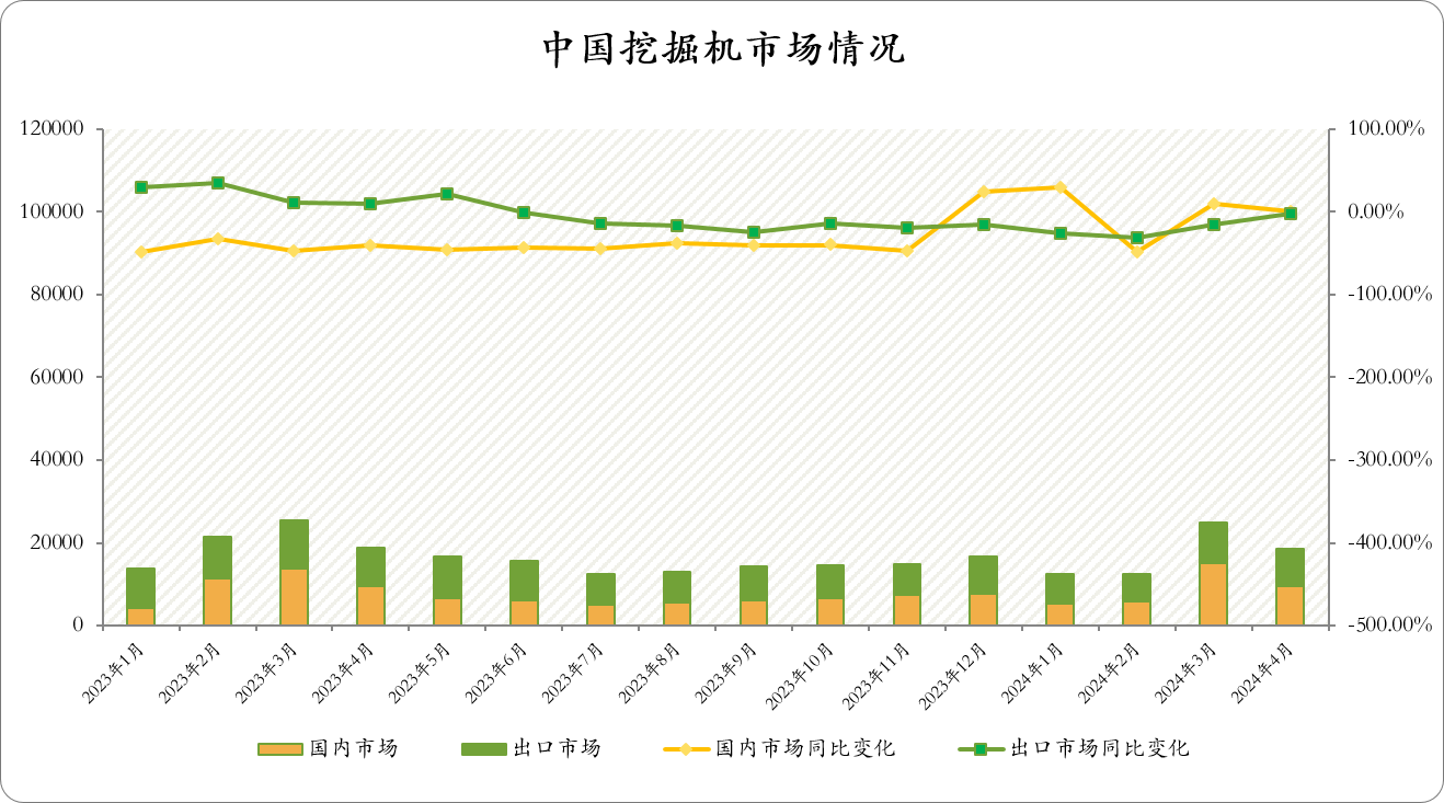经草根调查和市场研究,CME预估2024年4月挖掘机(含出口)销量18500台左右,同比下降1.5%左右,降幅环比有所改善。