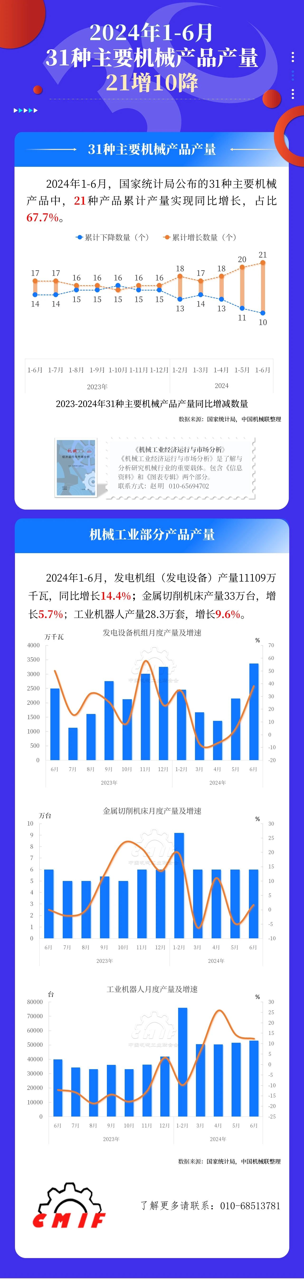 2024年1-6月,发电机组(发电设备)产量11109万千瓦,同比增长14.4%;金属切削机床产量33万台,增长5.7%;工业机器人产量28.3万套,增长9.6%。