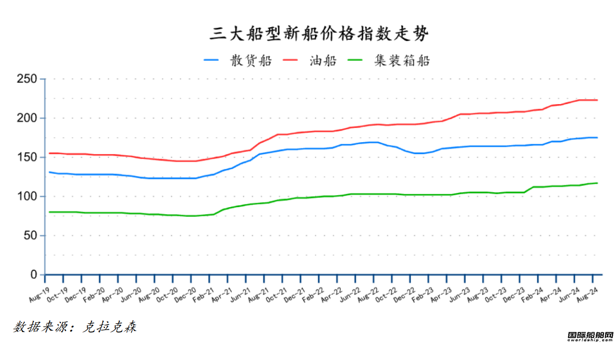8月份集装箱船新船价格指数环比上升1点至117点;散货船、油船新船价格指数环比均持平,分别为175点、223点。