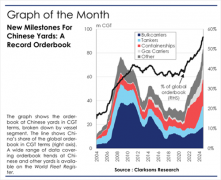 克拉克森指出,中国船企手持订单增长主要是由于船型结构日益多样化、加上船厂持续扩张产能。在2008年10月中国船企创纪录的手持订单中,约有50%为散货船,而如今散货船在中国手持订单中所占比例已下降到21%。