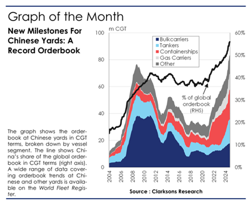 克拉克森表示,这些转变是由一系列因素推动的,其中包括中国在建造高端船型方面日益增长的专业技能和具有竞争力的价格水平。同时,中国也是当前全球造船业产能扩张的主导力量,生产力的提高、闲置设施的重新启用以及一些造船厂新宣布的扩张计划都有助于实现订单量的强劲增长。