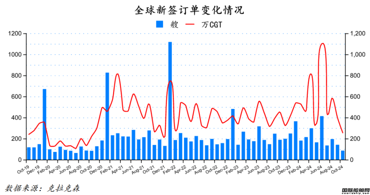 根据克拉克森最新数据统计(截至2024年11月9日),2024年10月份全球新签订单85艘,共计2,578,317CGT。与2024年9月份全球新签订单141艘,共计4,003,630CGT相比较,数量环比减少56艘,修正总吨环比下降35.60%。与2023年10月份全球新签订单188艘,共计4,570,224CGT相比较,数量同比减少103艘,修正总吨同比下降43.58%。