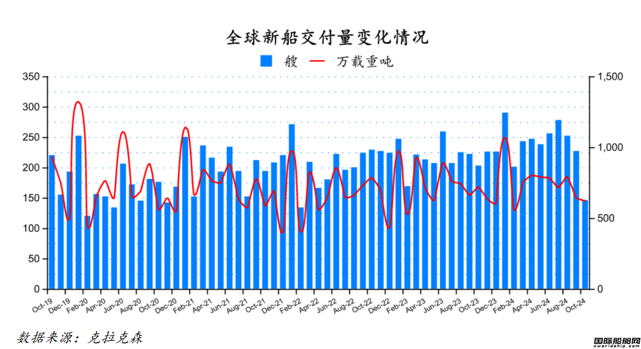 2024年10月份全球船厂共交付新船146艘,共计6,236,992载重吨。与2024年9月份全球新船交付订单227艘,共计6,458,360载重吨相比较,数量环比下跌35.68%,载重吨环比下降3.43%。与2023年10月份全球船厂共交付新船203艘,共计7,222,522载重吨相比较,数量同比下跌28.08%,载重吨同比下降13.64%。