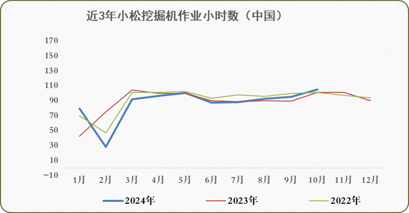 2024年10月,中国地区小松挖掘机开工小时数为105.3小时,同比增长4.3%。全球主要地区开工小时数均呈现增长趋势,欧洲和北美两个地区增长幅度超过5%,分别为6.5%和6.1%。