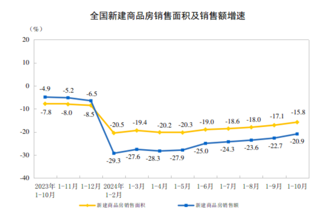 1-10月份,全国房地产开发投资86309亿元,同比下降10.3%;其中,住宅投资65644亿元,下降10.4%。
