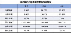 2024年12月销售各类挖掘机19369台,同比增长16%。其中国内销量9312台,同比增长22.1%;出口量10057台,同比增长10.8%。