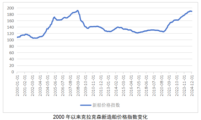 新造船价格保持在历史高位。以克拉克森船价指数为例,2024年12月,新造船价格指数收报189.16点,同比增长6.5%,保持2008年10月以来的新高。如果换个视角,以指数的年度均值来看,2024年新造船价格指数已经小幅超过2008年,创下历史新高。另外,部分新船型已经是历史新高。近年来,占市场份额较高的超大型集装箱船、17.4万方LNG运输船、9万方VLGC、9000车及以上PCTC等船型的船价均是历史新高。价格是市场走势的重要信号,我们要看2024年四季度以来造船价格指数明显进入平台期,预示当前市场供需两端出现了一些变化。
