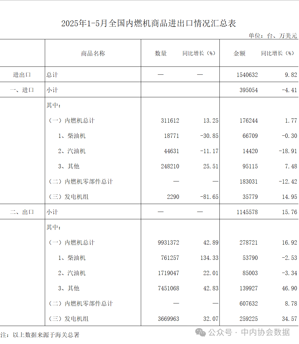 据海关总署数据整理,2025年1-5月内燃机行业进出口总额154.06亿美元,同比增长9.82%,其中,进口39.51亿美元,同比下降4.41%,出口114.56亿美元,同比增长15.76%。