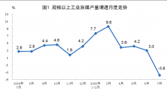 原煤生产有所下降。7月份,规上工业原煤产量3.8亿吨,同比下降3.8%;日均产量1229万吨。