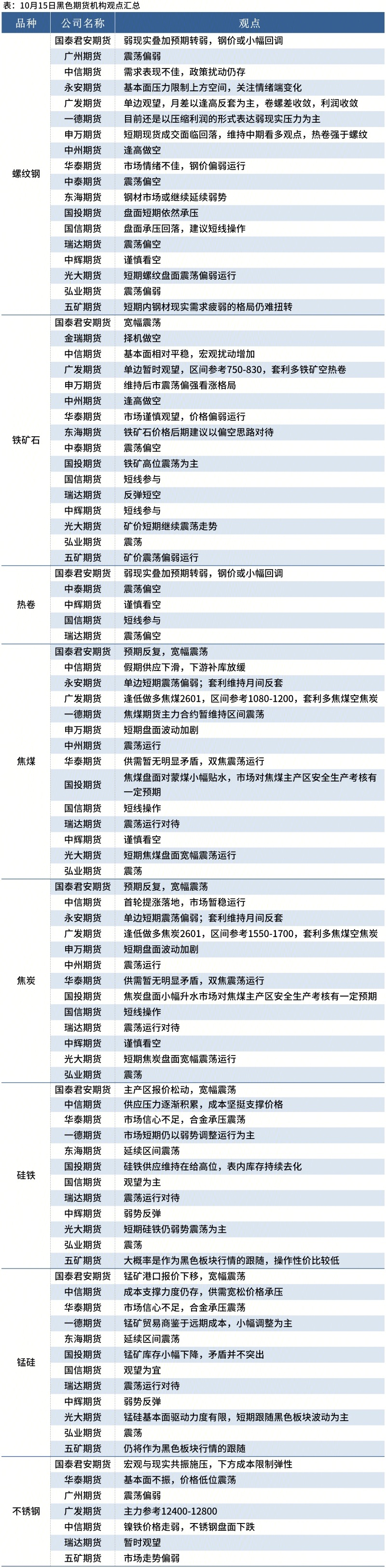 据Mysteel统计10月15日19家期货机构操作策略,其中多数机构料螺纹钢震荡偏弱,铁矿石震荡运行。具体汇总内容如下: