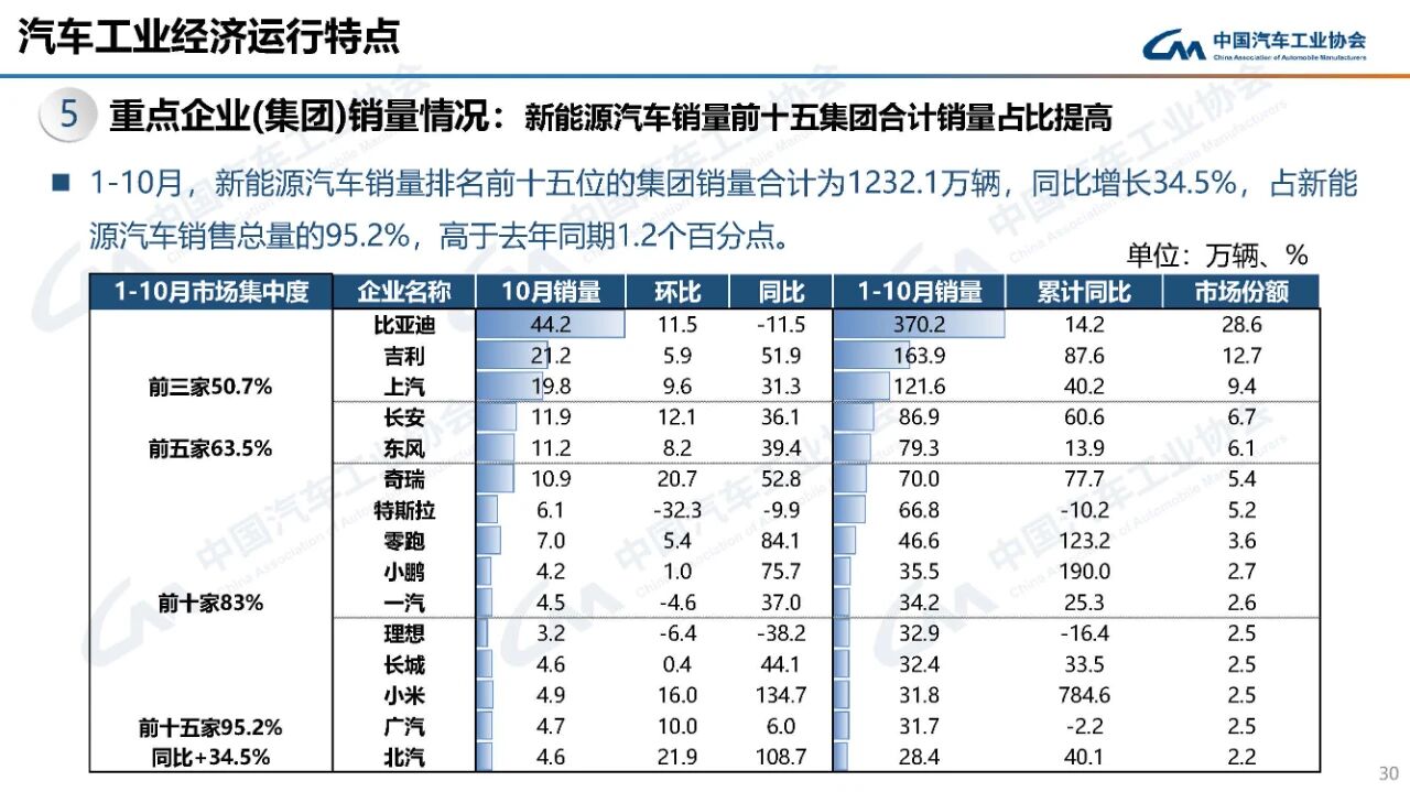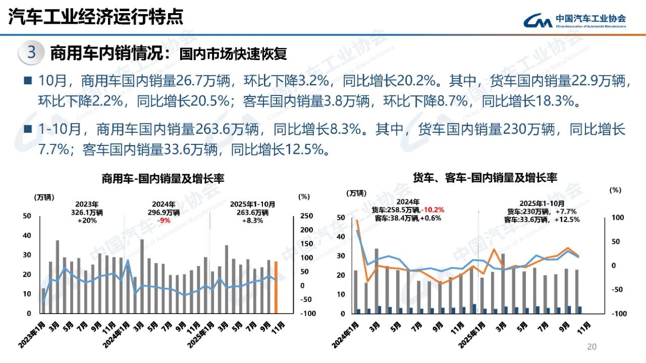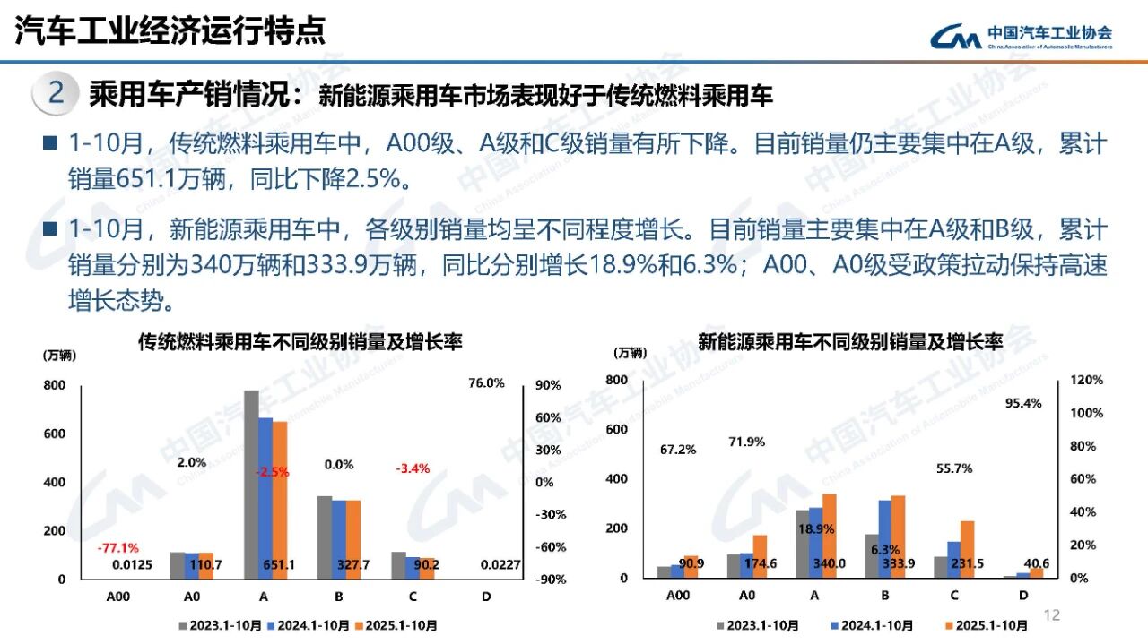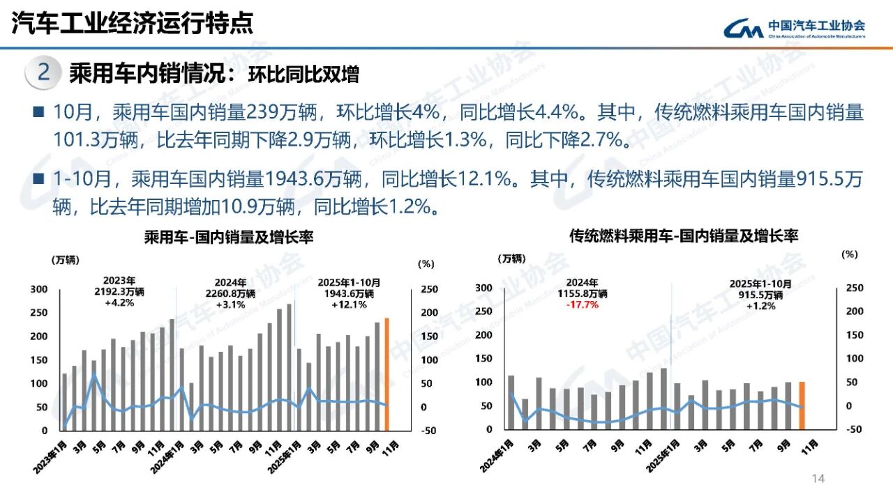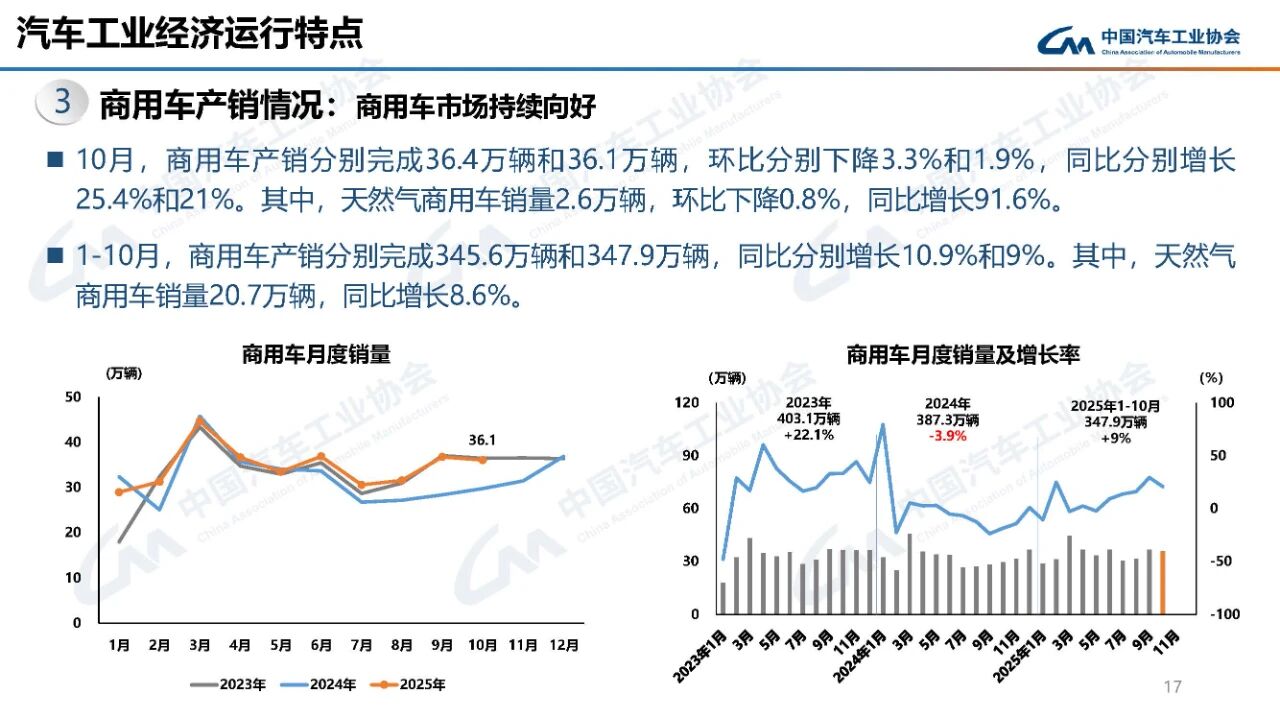 据中国汽车工业协会分析,10月,车企抢抓年底政策切换窗口期,生产供给保持较快节奏。企业新品继续密集上市、行业综合治理工作稳步推进,汽车市场延续良好发展态势,月度产销创同期新高。其中,乘用车市场稳健增长,商用车市场持续向好,新能源汽车较快增长,对外贸易呈现较好韧性。