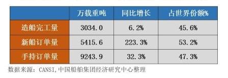 而中国造船业今年也强劲增长。中国船舶工业协会(CANSI)报告指出,今年前9个月新订单按吨位计算成长超过200%。该报告显示,中国造船企业造船完工量、新承接船舶订单量和手持船舶订单量三大造船指标增幅明显,继续保持全球第一的市场份额。中国船企总订单超过9200万载重吨,有将近九成订单出口到国际市场。受益于今年订单强劲成长,也帮助中国在全球造船业中保持50%的占有率。