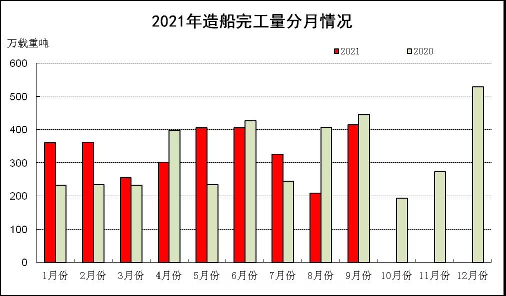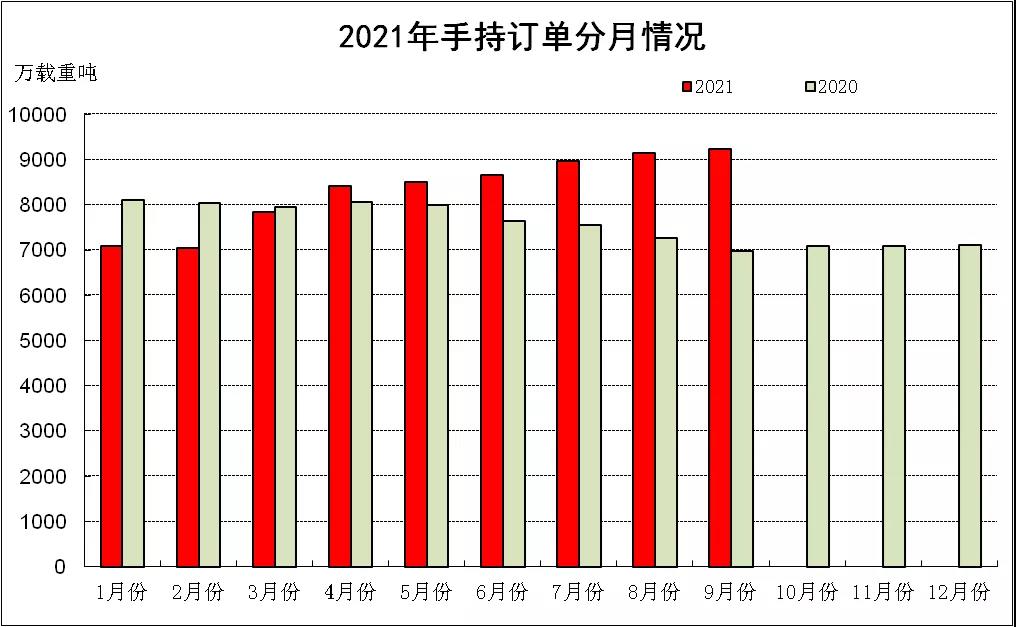 1~9月份,全国造船完工3034万载重吨,同比增长6.2%。承接新船订单5416万载重吨,同比增长223.3%。9月底,手持船舶订单9244万载重吨,同比增长32.3%,比2020年底手持订单增长30.0%。