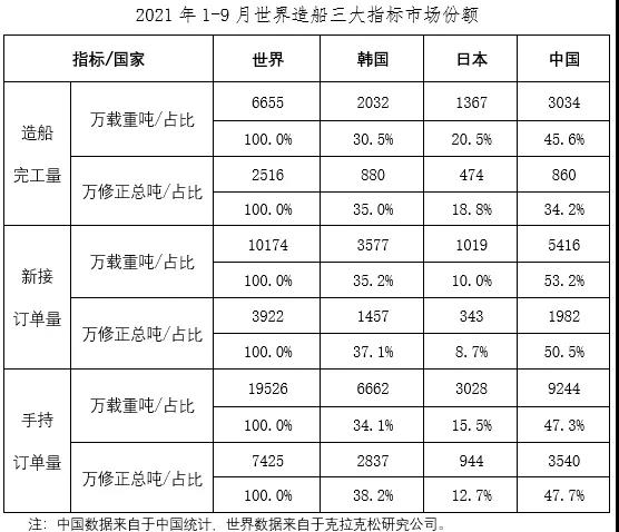 1~9月,我国造船完工量、新接订单量、手持订单量分别占世界市场份额的45.6%、53.2%和47.3%。