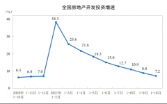 1—10月份,全国房地产开发投资124934亿元,同比增长7.2%;比2019年1—10月份增长14.0%,两年平均增长6.8%。其中,住宅投资94327亿元,增长9.3%。