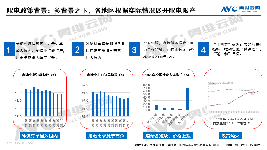 首先,受海外疫情影响大量订单涌入国内,制造业尤其是中小型企业扩能扩产导致用电量需求大幅提升。根据国家统计局数据,今年1月至7月,制造业新订单指数持续保持在扩张态势;其次,国内疫情风险等级降低,服务、餐饮、旅游等行业好转,经济水平虽然迅速恢复,但同时用电压力上涨;再次,为了应对秋冬供暖,各地区对煤炭的储备需求提升,而我国火力发电占比达到70%,电力用煤短缺,价格由今年五月500元/吨上涨到九月1400元/吨,10月中旬坑口价格突破2000元/吨。最后,国家在政策上也提出了约束,“十四五”规划提出的节能约束性指标,推动实现“碳达峰”、“碳中和”并对能源消耗进行考核。