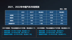 据中国汽车工业协会预测,2021年中国汽车总销量为2610万辆,同比增长3.1%。其中,乘用车销量为2130万辆,同比增长5.6%;商用车销量为480万辆,同比下降6.4%;新能源汽车销量为340万辆,同比增长1.5倍。2022年中国汽车总销量为2750万辆,同比增长5.4%,其中,乘用车销量为2300万辆,同比增长8%;商用车销量为450万辆,同比下降6%;新能源汽车销量为500万辆,同比增长47%。