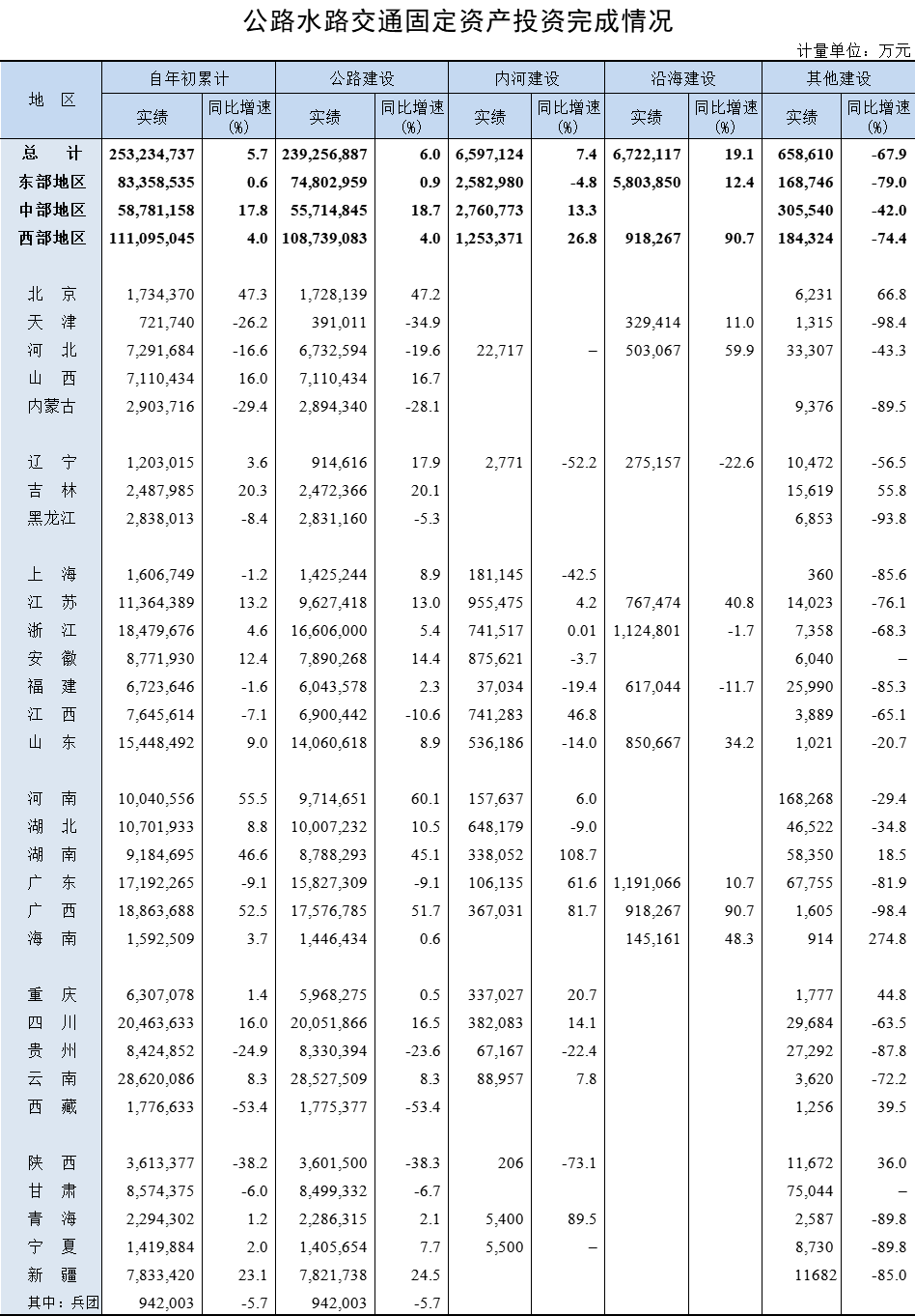 12月22日,交通运输部消息,2021年1-11月我国公路水路交通固定资产投资达25323亿元,同比增长5.7%。其中公路建投资达23926亿元,同比增长6.0%;内河建设投资达660亿元,同比增长7.4%;沿海建设投资达672亿元,同比增长19.1%。