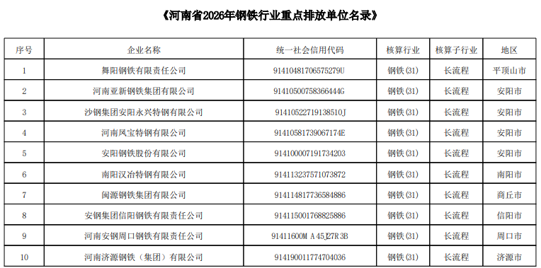 根据《碳排放权交易管理暂行条例》和生态环境部《关于做好2025年全国碳排放权交易市场有关工作的通知》有关要求,现对河南省2026年度纳入全国碳市场发电、钢铁(长流程)、水泥(硅酸盐水泥熟料)、铝冶炼(电解铝)行业重点排放单位名录(见附件)进行公示。
