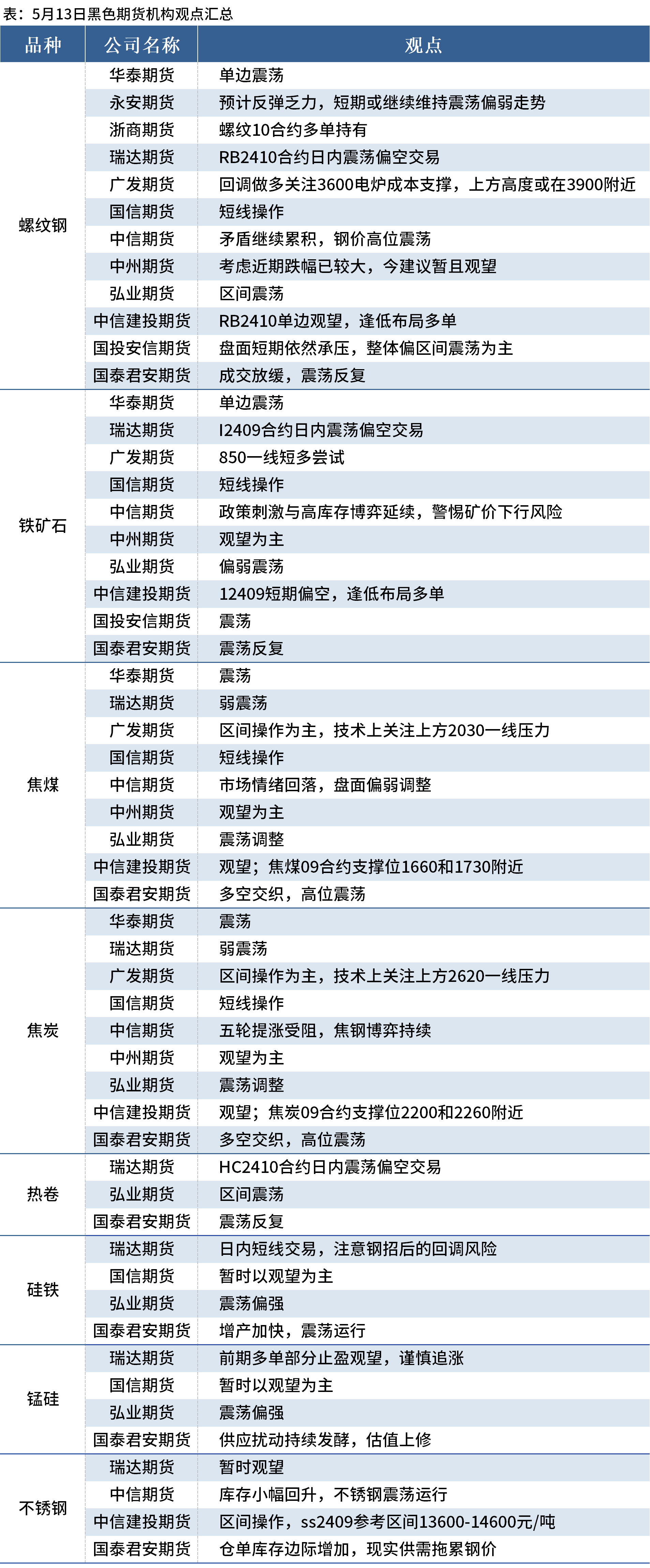 据Mysteel统计5月13日12家期货机构操作策略,其中多数机构料螺纹钢震荡运行,铁矿石震荡运行,焦煤、焦炭震荡运行。具体汇总内容如下: