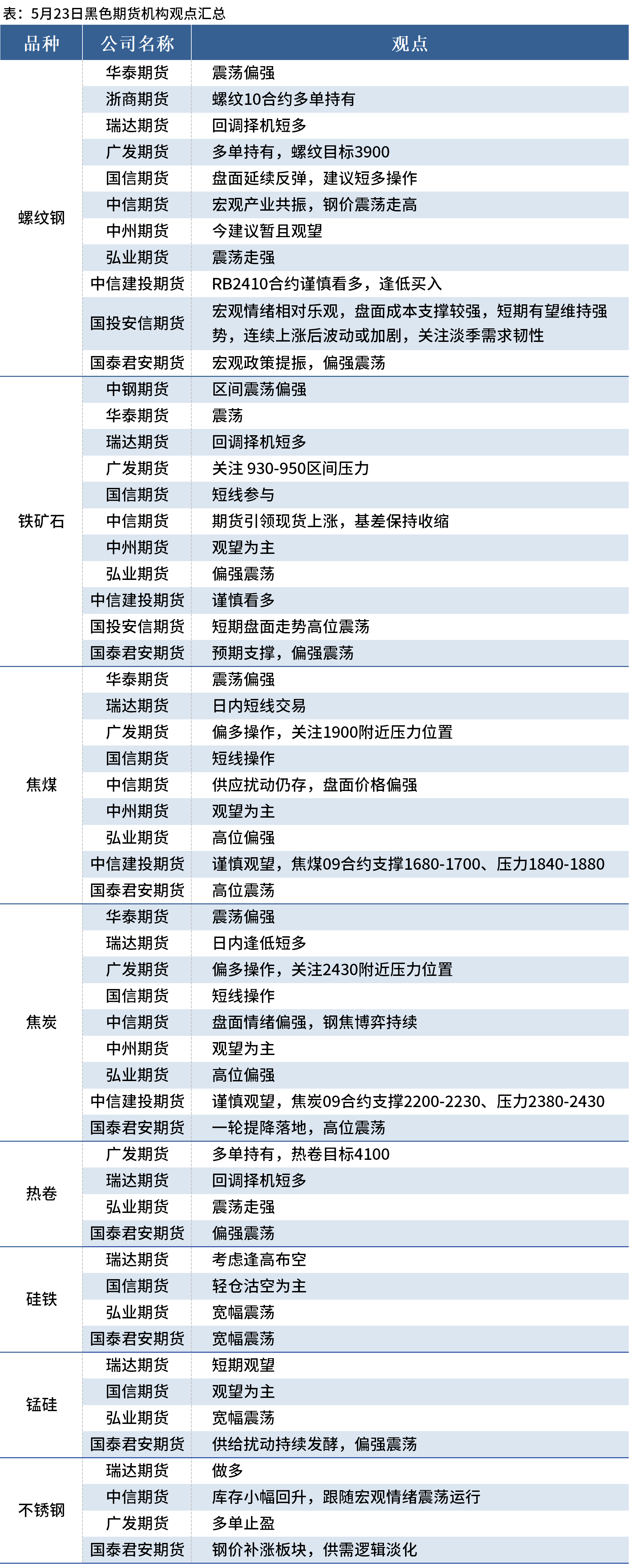 据Mysteel统计5月23日12家期货机构操作策略,其中多数机构料螺纹钢震荡偏强,铁矿石震荡偏强,焦煤、焦炭震荡偏强。具体汇总内容如下: