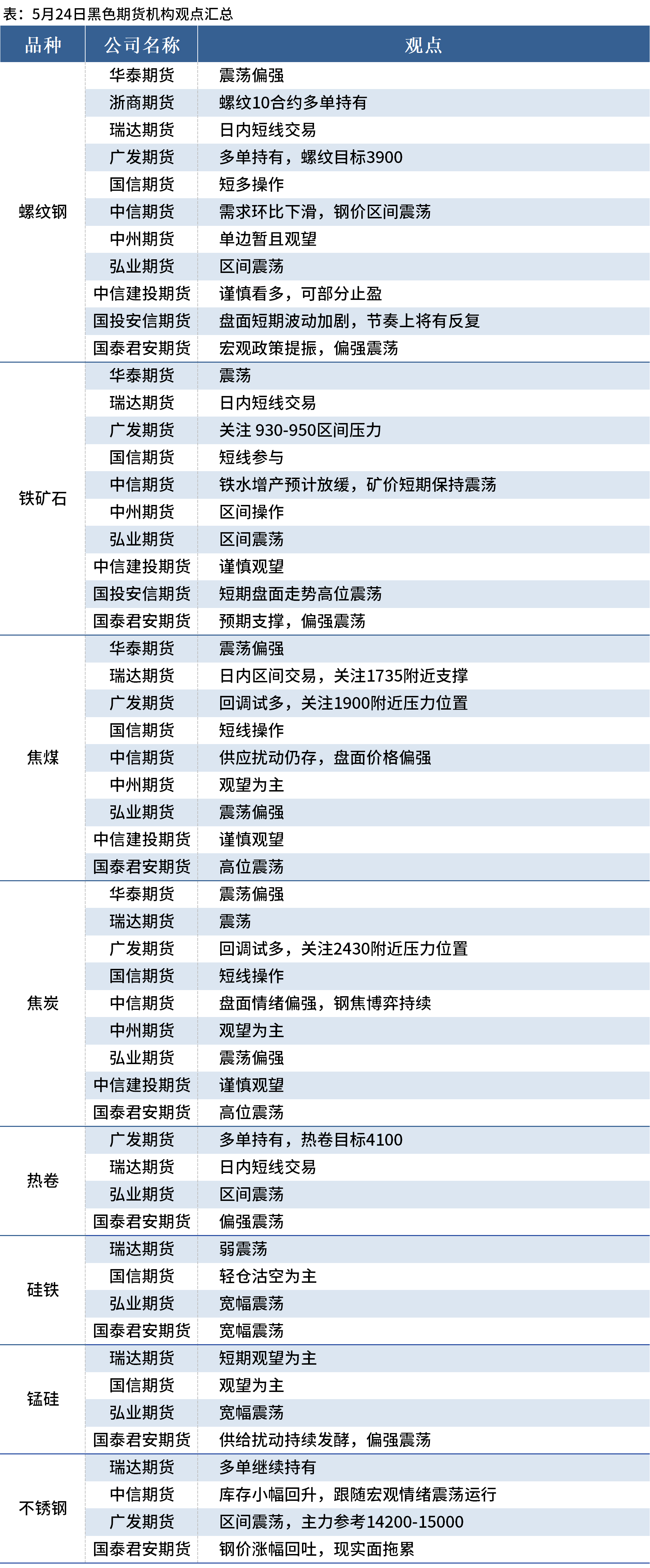 据Mysteel统计5月24日12家期货机构操作策略,其中多数机构料螺纹钢震荡运行,铁矿石震荡运行,焦煤、焦炭震荡运行。具体汇总内容如下: