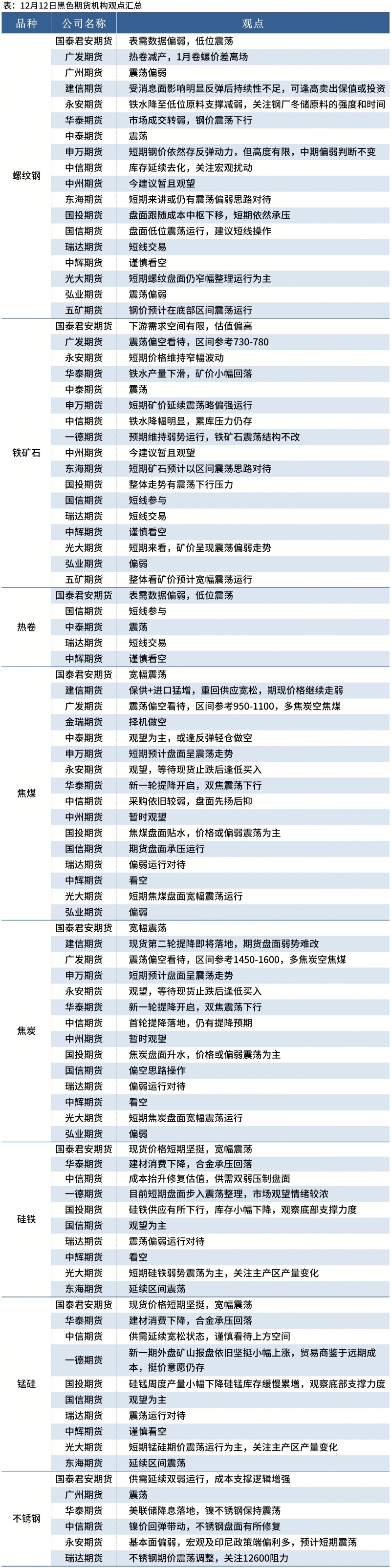 截至12月12日9点30分,黑色期货市场各品种全部下跌,焦煤跌超3%,焦炭跌超1%,螺纹钢、热卷、铁矿石、硅铁、锰硅下跌。