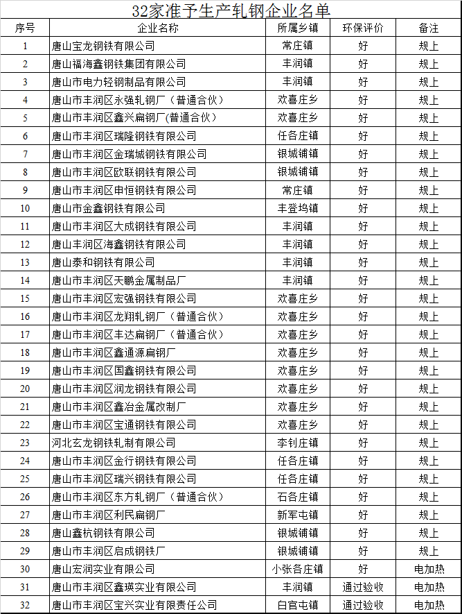 鉴于我区轧钢企业在全区产业中比重大,对本区经济指标和社会发展影响较大,而且大部分企业完成了环保深度治理,部分企业达到了环保治理“好”的标准,为鼓励企业规模发展、绿色环保发展,经区生态办研究,特准予既属于规模以上企业、又达到环保治理“好”的标准企业以及电加热企业共32家企业在5月份下半月期间达标排放前提下生产。