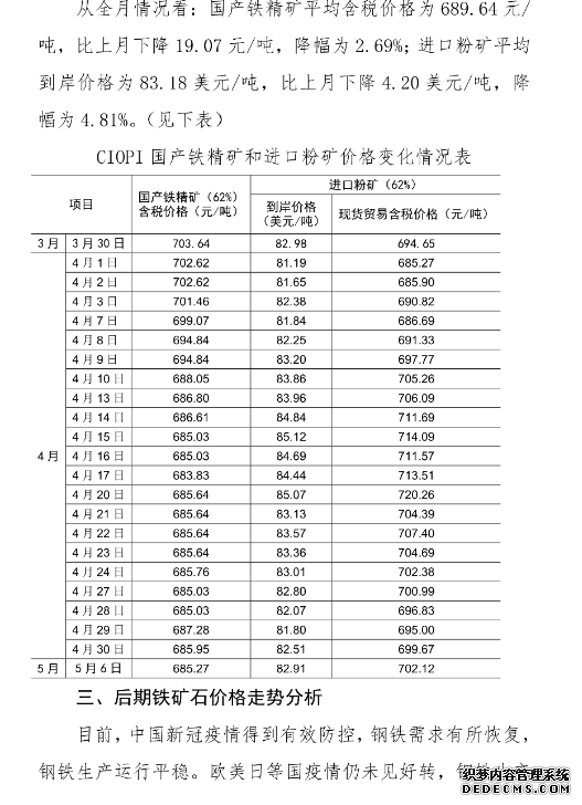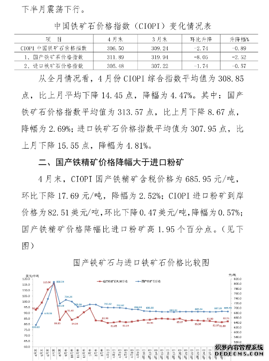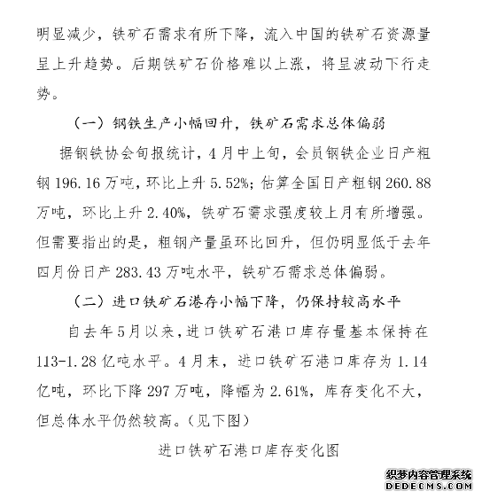 中钢协:4月份铁矿石价格小幅下降 后期将呈波动下行走势
