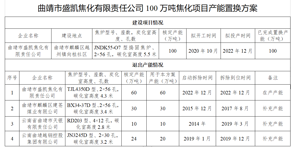 根据《云南省工业和信息化厅云南省发展和改革委员会云南省自然资源厅云南省生态环境厅云南省应急管理厅关于印发云南省焦化产能置换工作方案(试行)的通知》(云工信石化〔2022〕160号)有关要求,现将“曲靖市盛凯焦化有限责任公司100万吨焦化项目产能置换方案”予以公示,公示期为2022年8月23日至9月5日。如有异议,请在公示期内向曲靖市工业和信息化局反映,欢迎社会公众进行监督。