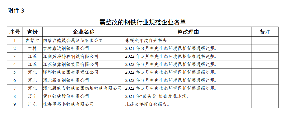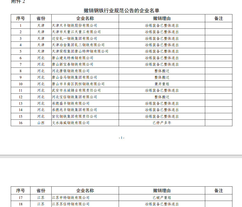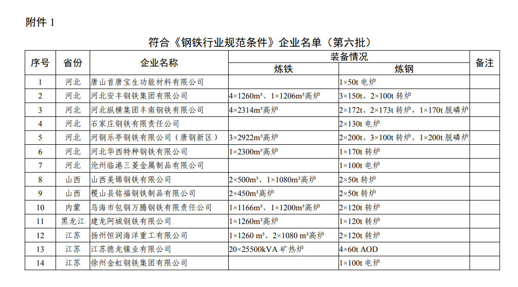 根据《钢铁行业规范条件(2015年修订)》和《钢铁行业规范企业管理办法》,我部开展了钢铁规范企业动态调整工作。经企业自查、地方工业和信息化主管部门和有关中央企业初审、专家评审、网上公示等程序,现对符合《钢铁行业规范条件》企业名单(第六批)、撤销钢铁行业规范公告的企业名单、需整改的钢铁行业规范企业名单、变更钢铁行业规范公告名称的企业名单予以公告。