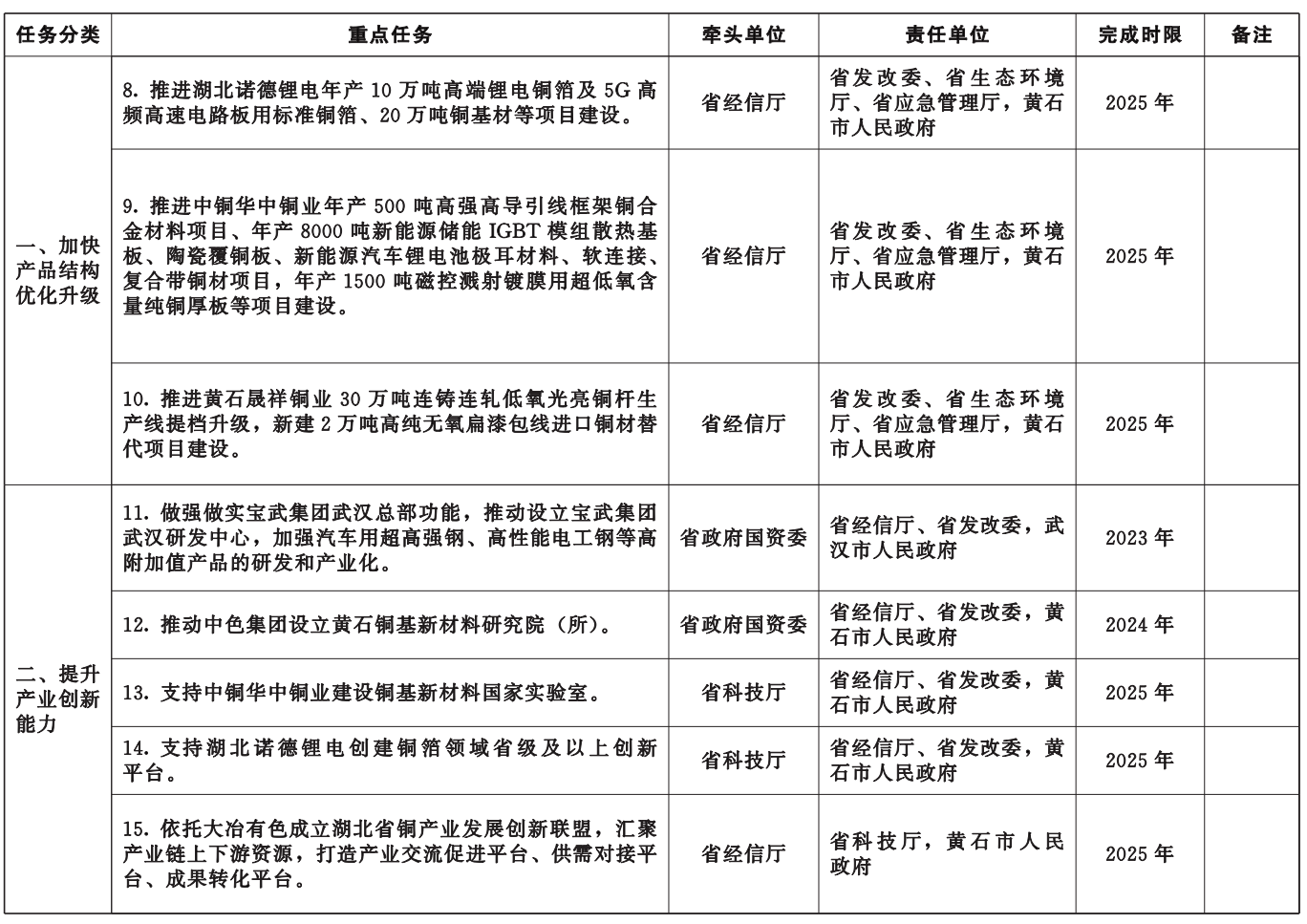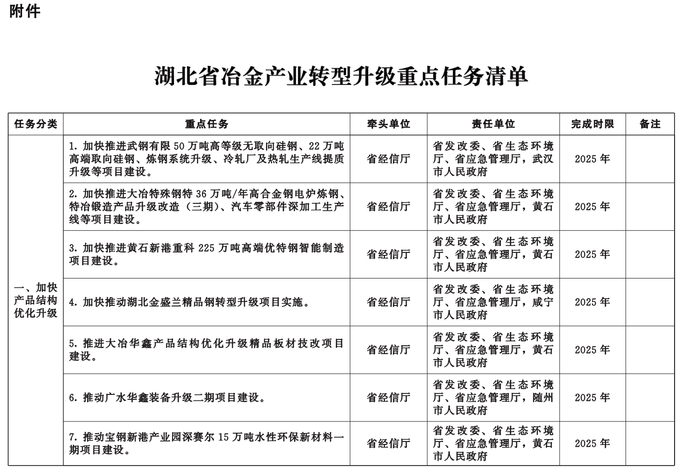 附件:湖北省冶金产业转型升级重点任务清单