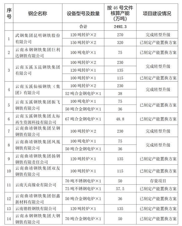 按照《国务院关于化解产能严重过剩矛盾的指导意见》(国发〔2013〕41号)、《国务院关于钢铁行业化解过剩产能实现脱困发展的的意见》(国发〔2016〕6号)、《工业和信息化部关于印发钢铁行业产能置换实施办法的通知》(工信部原〔2021〕46号)、《云南省人民政府关于钢铁行业化解过剩产能实现脱困发展的实施意见》(云政发〔2016〕51号)有关要求,为落实国家移交2021年长江经济带生态环境问题中粗钢问题整改工作,规范行业发展秩序,加快推动全省钢铁行业转型升级,实现绿色低碳高质量发展,形成云南省冶炼装备清单。