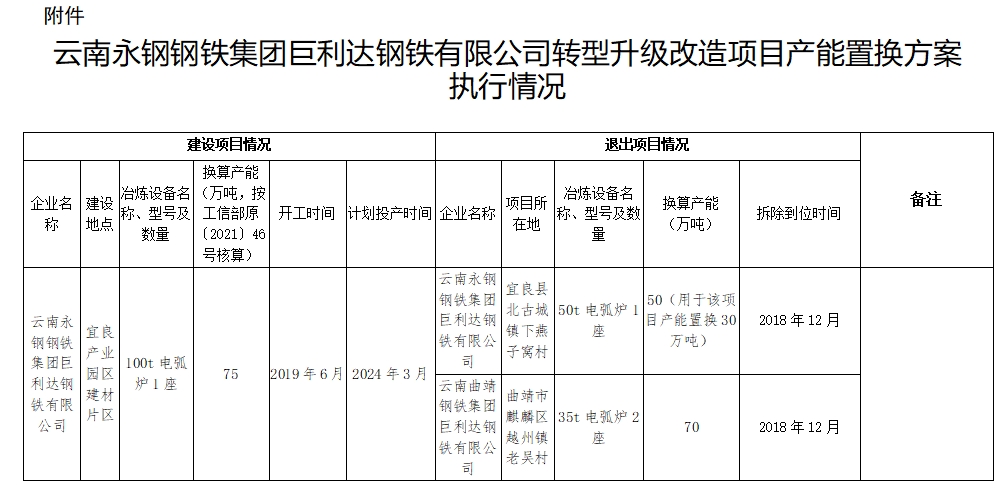 为贯彻落实钢铁行业产能置换实施办法关于监督落实产能置换方案执行到位的有关要求,昆明市工业和信息化局对“云南永钢钢铁集团巨利达钢铁有限公司转型升级改造项目产能置换方案”(云南省工业和信息化委员会公告2017年第17号)执行情况开展了核实验收,现将云南永钢钢铁集团巨利达钢铁有限公司转型升级改造项目产能置换方案执行情况予以公示,公示期为2024年1月23日至2024年1月29日。公示期间,如有异议,请向昆明市工业和信息化局反映,欢迎社会公众进行监督。