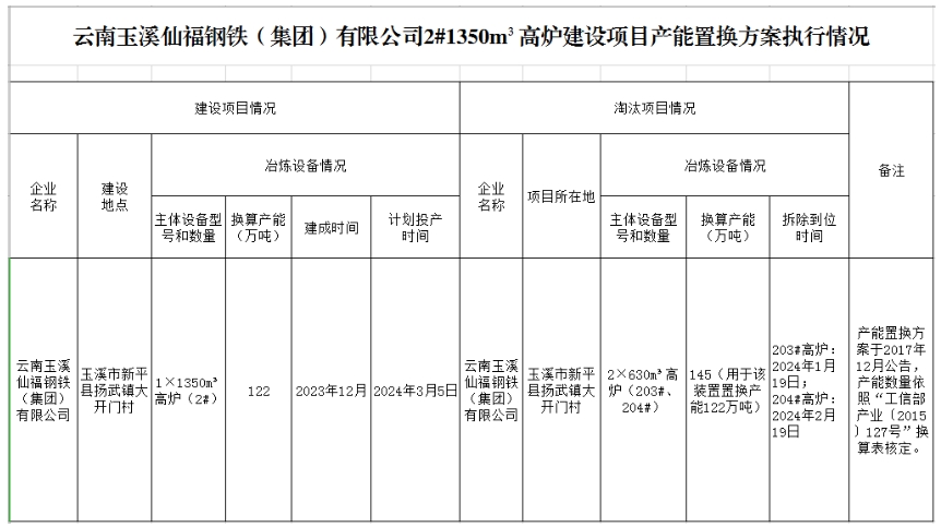 附件:云南玉溪仙福钢铁(集团)有限公司2#1350m³高炉建设项目产能置换方案执行情况